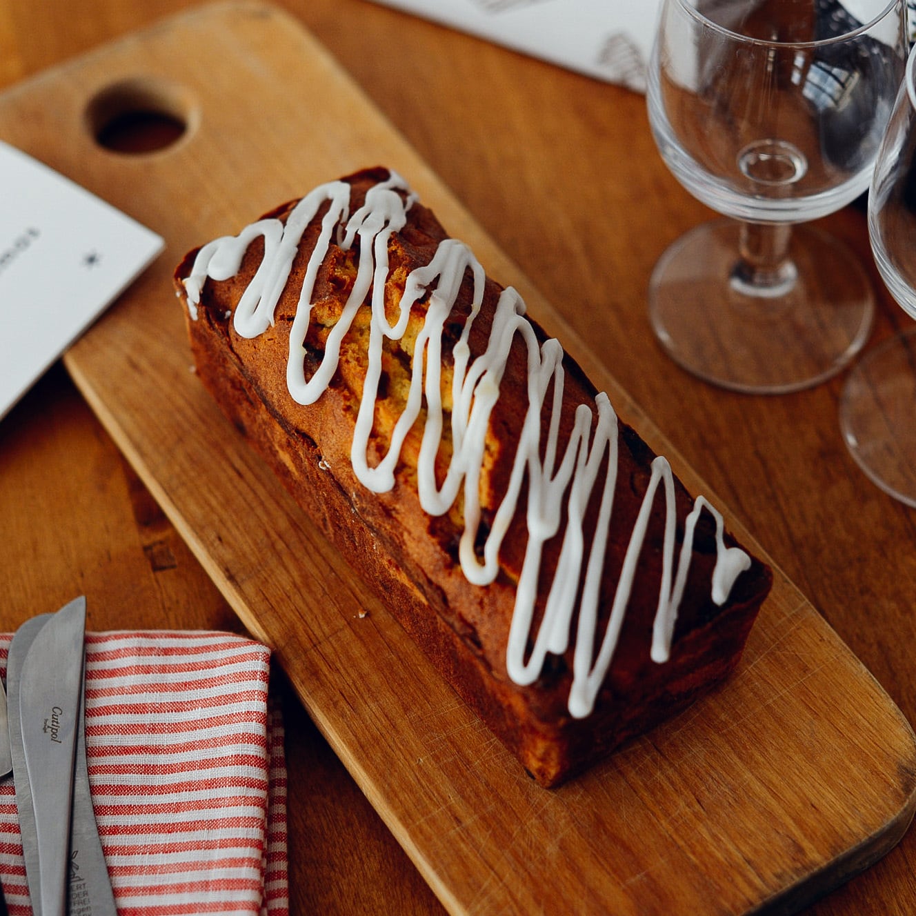 ダークラムベースのシロップにしっかり漬けたいちじくとレーズン、セミドライのクランベリーとシロップ煮にしたオレンジピールをたっぷり加えて焼き上げ、ラムとブランデーの自家製シロップを打って、甘酸っぱいアイシングてをかけて仕上げました。