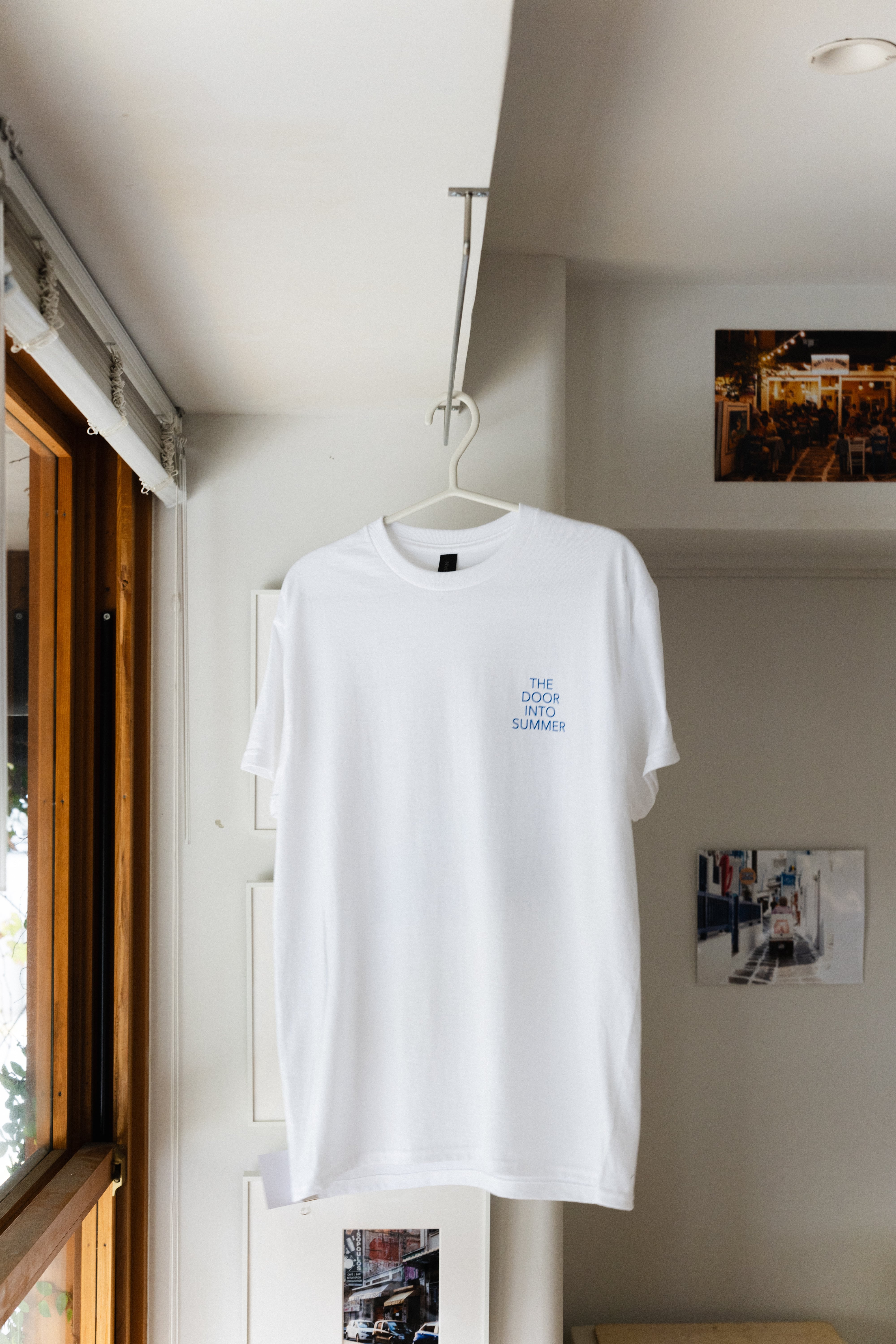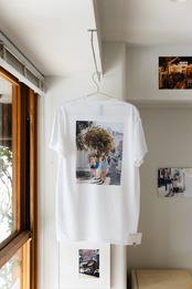 ミコノス島の写真をバックにプリント、表面は左胸に小さく写真展のタイトルをプリントしました。、ボディはGILDAN 6.0ozの白です。